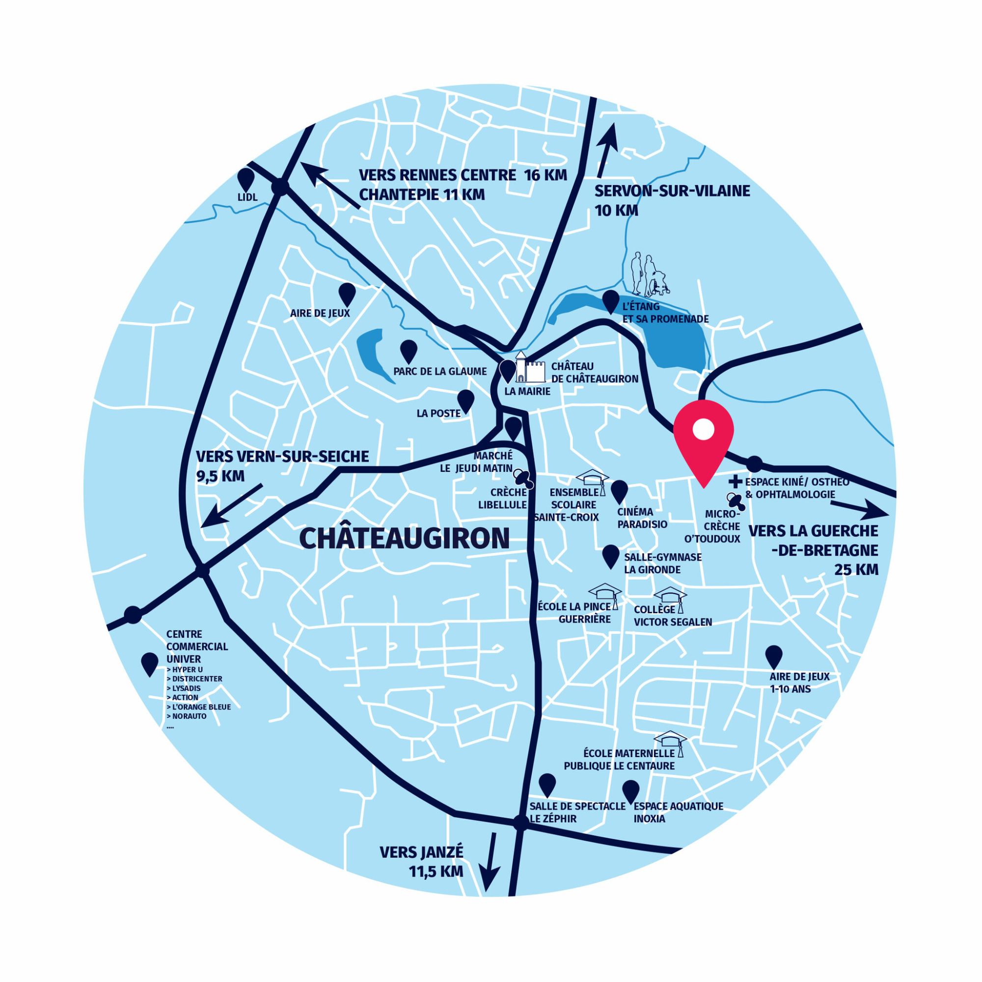 La ville de Châteaugiron est à 15 kilomètres de Rennes et a su préserver un patrimoine architectural extraordinaire. Elle propose de nombreux commerces en ville à proximité de Rennes (magasins en centre-ville, quartier d'affaires Univers...)